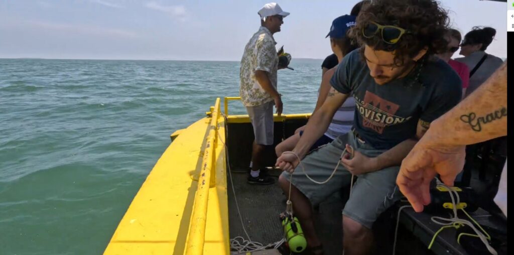 We started the trip at Kelley’s Island ferry terminal, crossing into Lake Erie for a hands-on science experience. Jim led an on-site discussion about lake stratification and seasonal water dynamics. In this region, where the lake is relatively shallow (approximately 30 feet or 10 meters), vertical stratification is less pronounced than in the deeper eastern basin. Still, the area faces serious environmental stressors. Harmful algal blooms (HABs), driven by excess nutrient loading, lead to large hypoxic zones and degraded water clarity. These disruptions have direct economic consequences for Lake Erie’s $1.5 billion recreational fishing industry (*) —especially for species like walleye and yellow perch.